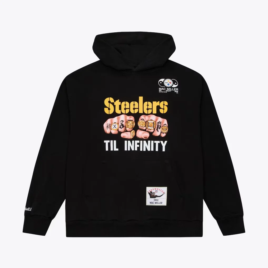 For those seeking a more graphic representation of Miller’s persona, the "Til Infinity" Hoodie in black offers a unique visual. The front features a graphic of two fists wearing Super Bowl-style championship rings, a design that references Miller’s own hand tattoos and the Steelers’ storied history of six Super Bowl titles. This blending of personal artist iconography with team achievements is a hallmark of the collection’s design philosophy.